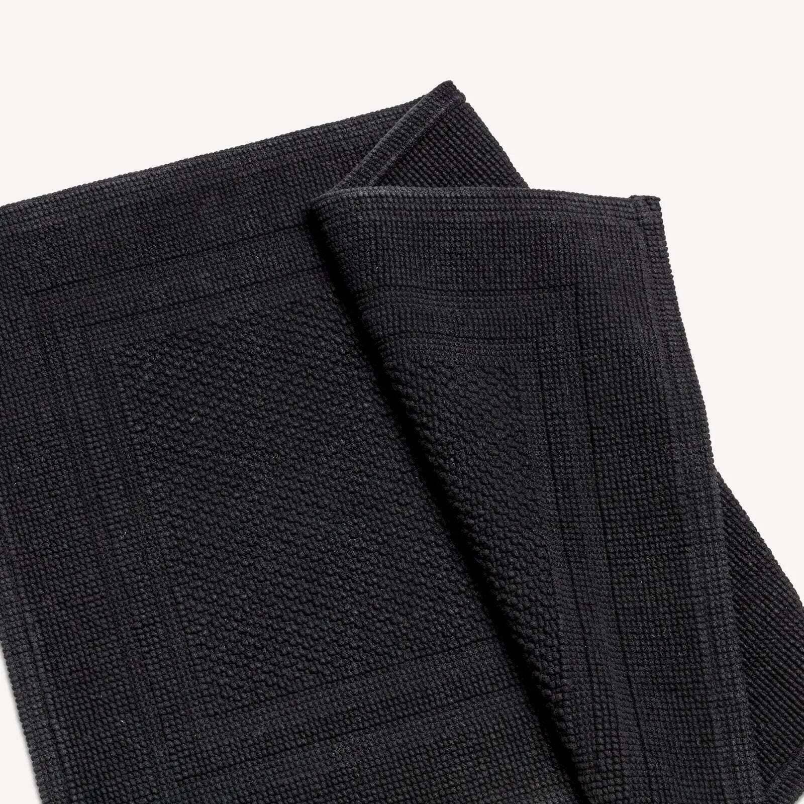 Add texture and sophistication to your bathroom with the meticulously crafted Fina Bath Mat in Black. Designed with a substantial weight, it offers a plush, cushiony feel underfoot, while its absorbent 100% cotton construction enhances the sensation of walking on clouds.