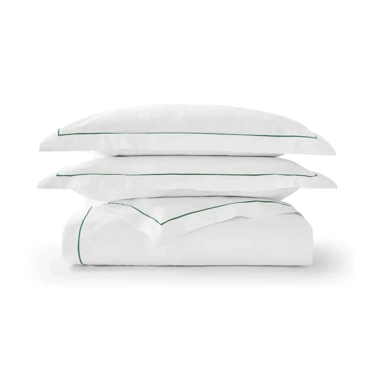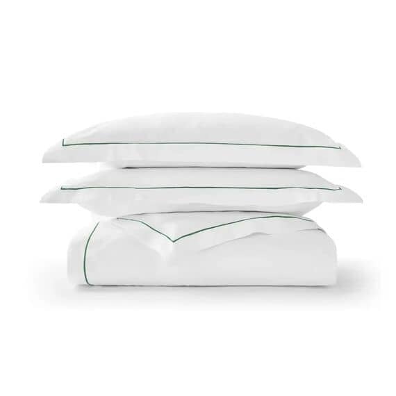 Finished with a refined green trim for an elegant touch, this duvet set combines moisture-wicking breathability with long-lasting durability. Its lustrous fabric softens further after each wash, providing year-round comfort and effortless sophistication for modern living.
