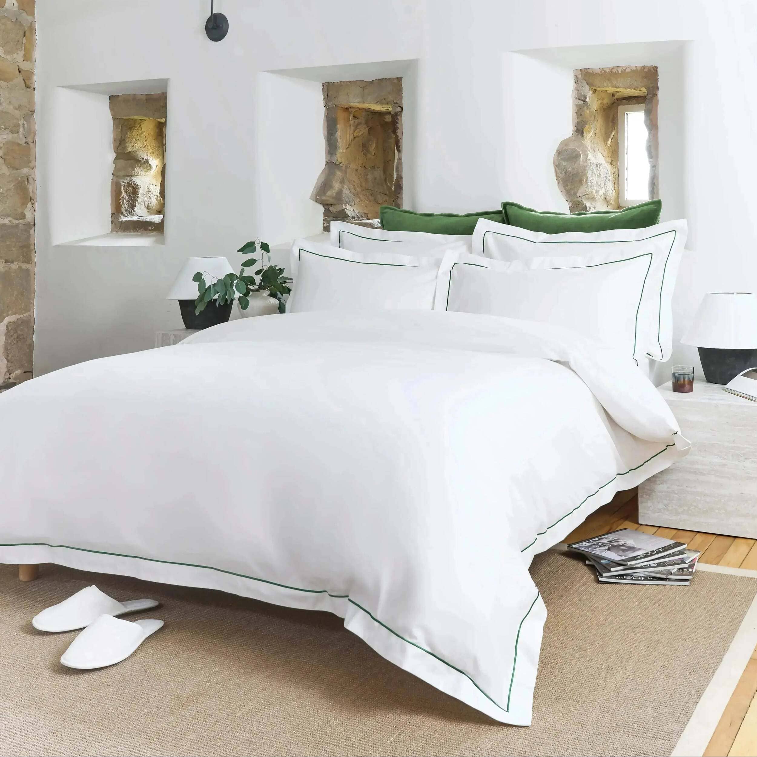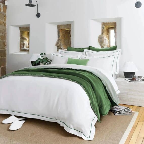 Finished with a delicate green trim for subtle contrast, this duvet set elevates your bedroom with understated sophistication. Softening beautifully after every wash, the Christy Premium Sateen Duvet Set offers year-round comfort and timeless luxury for a restful night’s sleep.
