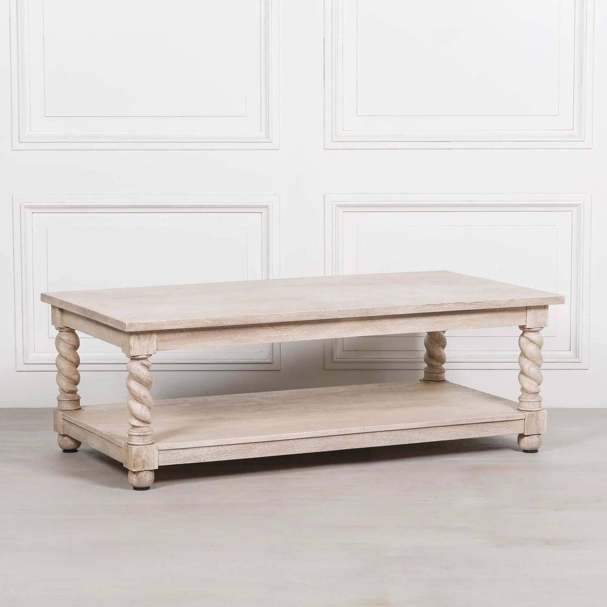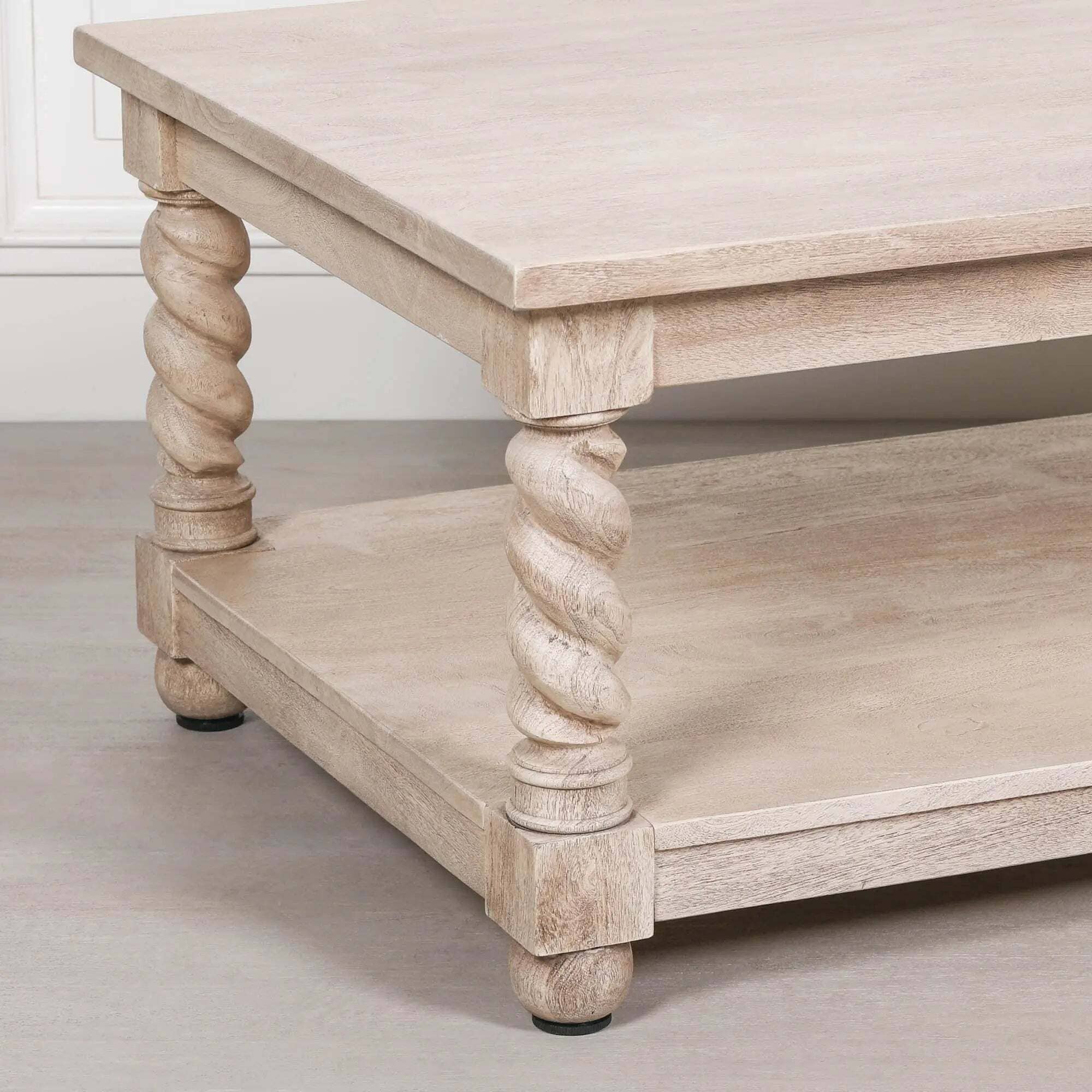The Acacia Twist Column Coffee Table brings artisanal craftsmanship and timeless character to your living space. Handcrafted from solid acacia wood, it features beautifully carved spiral column legs that add sculptural detail and traditional charm. The natural washed wood finish enhances the grain’s warmth and texture, creating an inviting focal point that suits both classic and contemporary interiors.