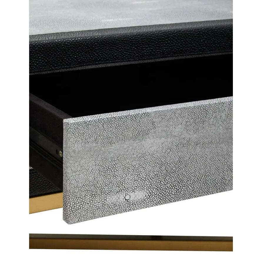 The Caviz Grey Shagreen Coffee Table showcases sleek sophistication and contemporary design. Crafted with a textured grey shagreen body framed by a refined black border, this coffee table exudes understated luxury.
