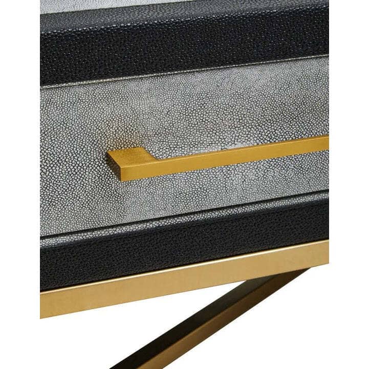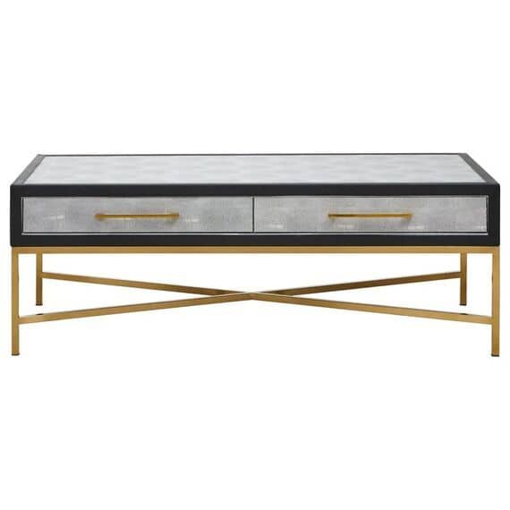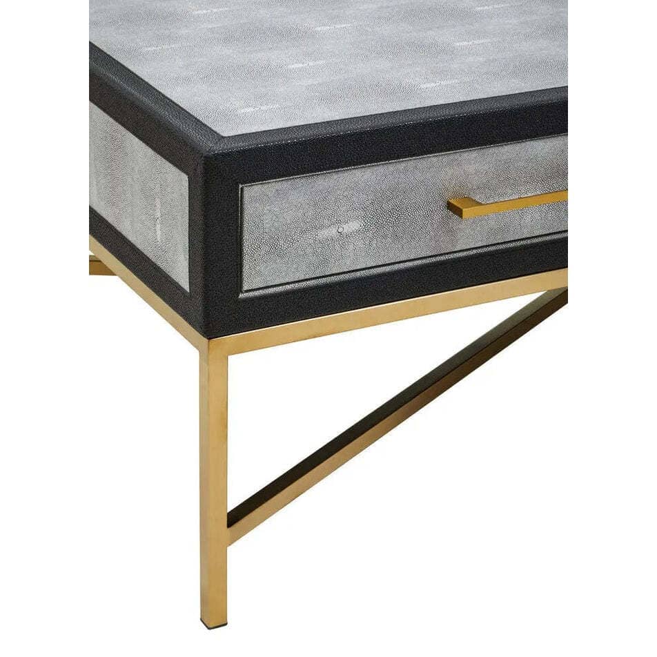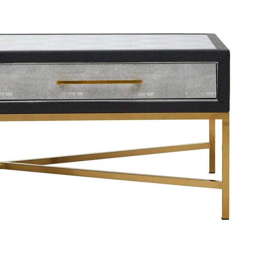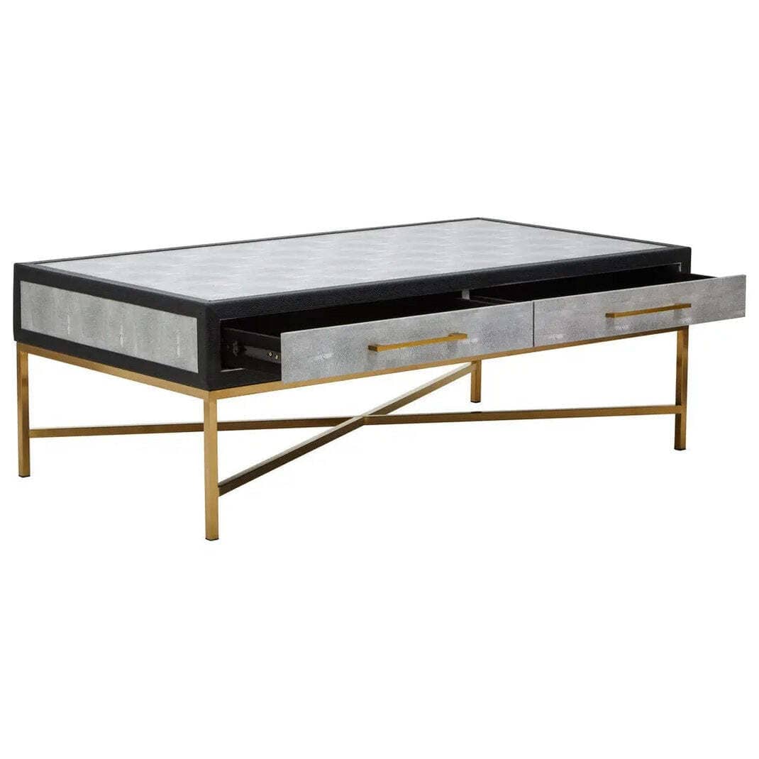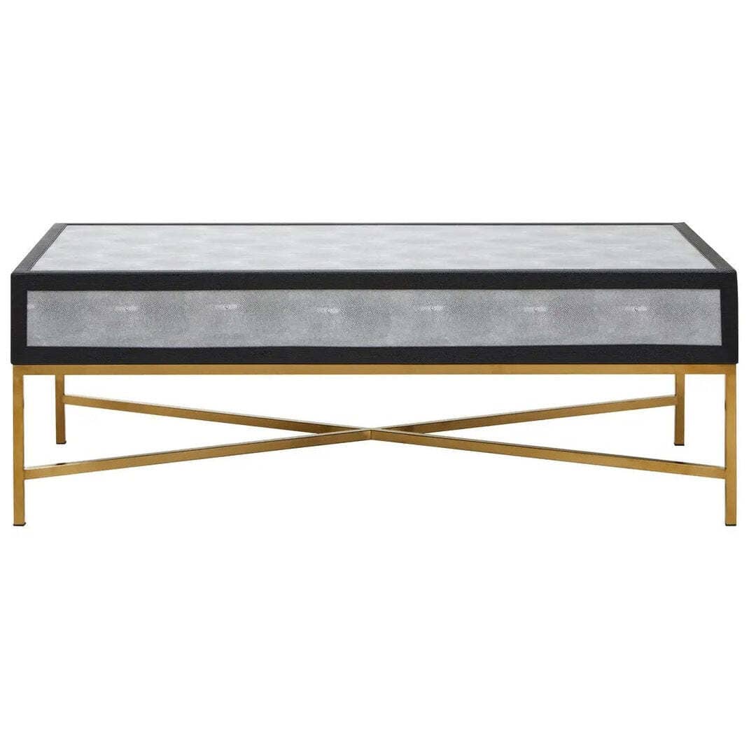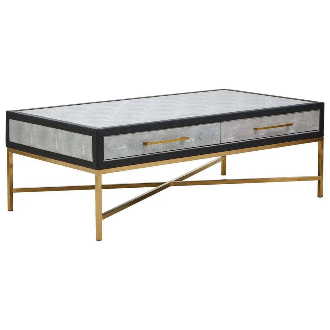 The brushed matte gold cross base adds a striking contrast, lending elegance and stability to the piece. Simple yet chic drawer handles complement the clean lines, while the ample tabletop makes it ideal for styling with books, trays, or décor. Perfect for modern and luxury living spaces, this grey shagreen coffee table balances texture, tone, and form beautifully.