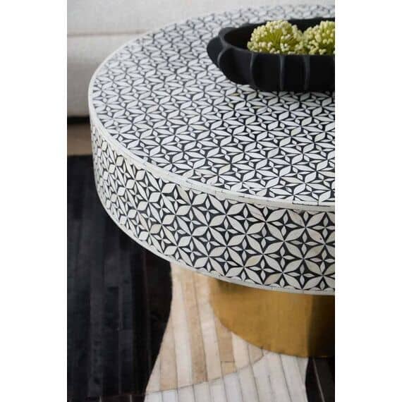 Bring artisanal elegance to your living room with the Fazion Round Bone Inlay Coffee Table With Gold Base. Handcrafted by skilled artisans, its rounded silhouette and column base showcase a striking black-and-white bone inlay pattern that wraps seamlessly across the spacious top for a bold, graphic look.