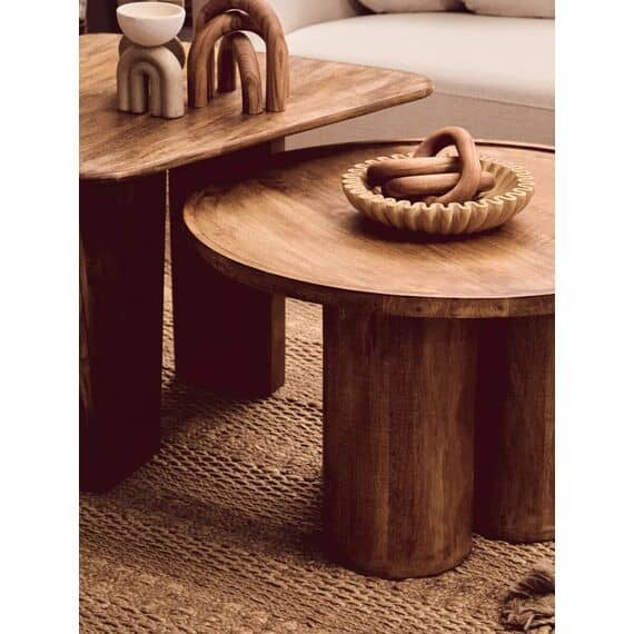 A fusion of form and function, this coffee table features a gracefully curved base transitioning into a pillared design. Its natural grain and texture align seamlessly with the simplicity of this handcrafted masterpiece.